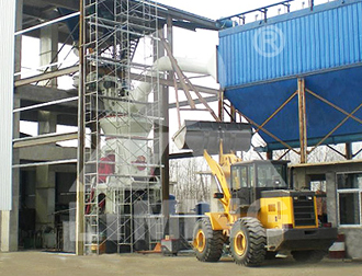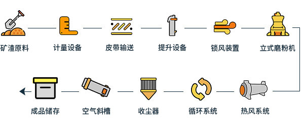 礦渣原料由鏟車取料、喂料,通過皮帶機進行輸送。在輸送過程中,礦渣原料先后經(jīng)由除鐵器和振動篩除鐵和篩分,然后通過提升機進入LM立式磨粉機進行粉磨。粉磨后的礦渣借助熱風爐提供的熱風,通過選粉機進行選粉,同時烘干。符合細度要求的礦渣粉后被輸送到收塵器收集、盛放后,由空氣輸送斜槽、提升機進入成品庫中儲存。