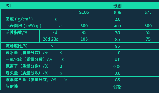 | 礦渣粉質(zhì)量 | 比表面積達到 | 420~500 m2/kg |