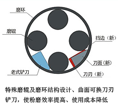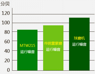 運(yùn)行噪音:新型縱擺結(jié)構(gòu),磨輥和磨環(huán)在研磨過(guò)程中不直接接觸,機(jī)器振動(dòng)小,噪音低,其噪音比球磨機(jī)低約25-30分貝