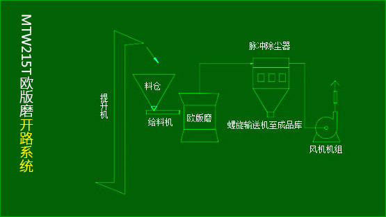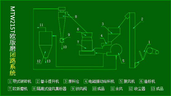 MTW215T歐版磨為立式結(jié)構(gòu),占地面積小,成套性強(qiáng)。主要由主機(jī)、風(fēng)機(jī)、選粉機(jī)、專用除塵器、旋風(fēng)集粉器、管道裝置和電機(jī)組成。配套輔助設(shè)備包括顎式破碎機(jī)、畚斗提升機(jī)、電磁振動(dòng)給料機(jī)、料倉(cāng)、配電柜等。 MTW215T歐版磨為碾壓成粉,是一個(gè)密閉的循環(huán)系統(tǒng),在負(fù)壓狀態(tài)下循環(huán)流動(dòng)。該設(shè)備主要部件均采用品質(zhì)良好鋼材制造,整機(jī)耐用可靠,自動(dòng)化程度高,是目前理想的粉磨設(shè)備。