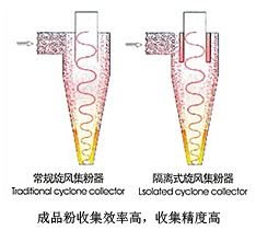 變頻式分析機(jī)+隔離式旋風(fēng)集粉器,選粉和集粉效率高,成品粒度可達(dá)1.6-0.045mm。