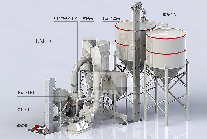 歐式磨粉機(jī)整套設(shè)備主要由主機(jī)、選粉機(jī)、風(fēng)機(jī)、顎破、畚斗提升機(jī)、電磁振動(dòng)給料機(jī)、儲(chǔ)料倉(cāng)、布袋除塵器、管道裝置、旋風(fēng)集粉器、電控柜、電機(jī)等組成。
