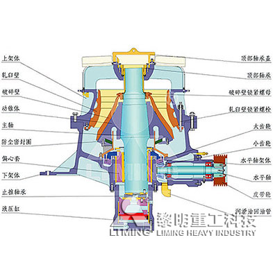 工作時,由電動機帶動水平軸旋轉(zhuǎn),水平軸通過齒輪帶動偏心套旋轉(zhuǎn),再由偏心套帶動動錐部做圓周擺動,從而實現(xiàn)連續(xù)的擠壓破碎石塊。