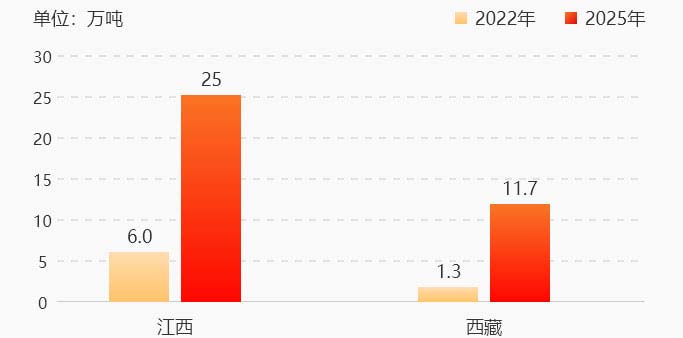 萬(wàn)噸,占據(jù)全國(guó)資源總產(chǎn)出量60%以上。江西2025將接近25LCE萬(wàn)噸,